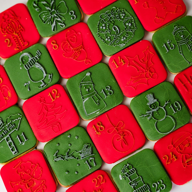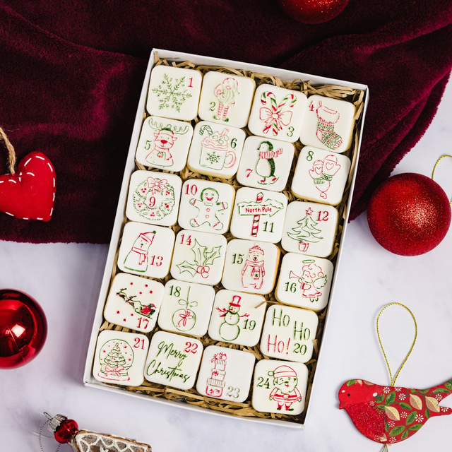 24 adorable advent calendar biscuits, decorated with luxury Swiss fondant. Available in Classic White or Holly Red/Green. Each biscuit is individually wrapped for freshness and beautifully presented in a gift box. Perfect for gifting.
